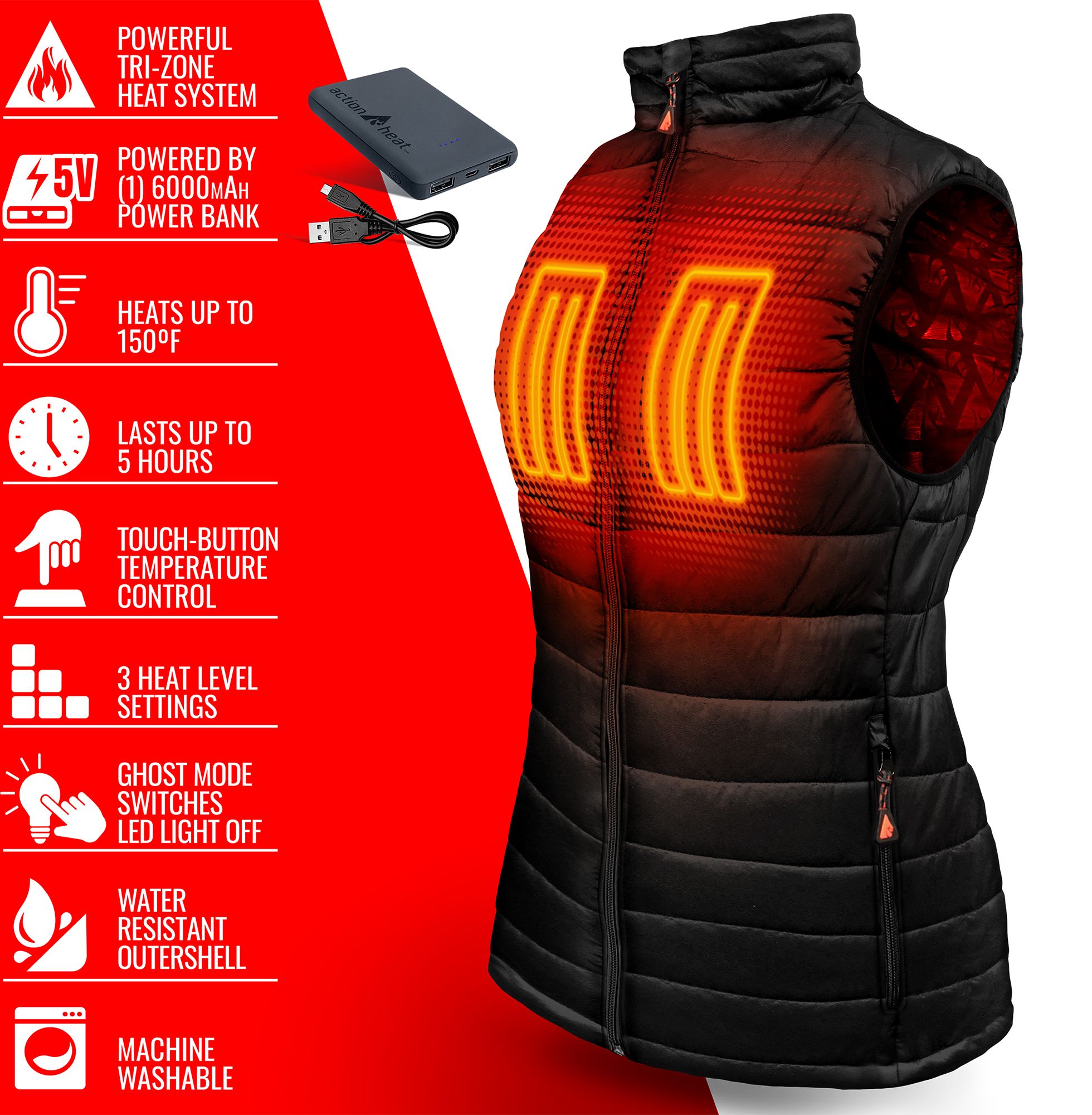 Never feel cold again with the ActionHeat® 5V Battery Heated Puffer Vest. Featuring the powerful ActionHeat® 5V Power Bank, this technology warms your garment and can also charge your phone, tablet, or any USB charged device. The water-resistant outer softshell, heat trapping insulation layer and ActionFlex built-in heating panels provide lightweight warmth, comfort, and versatility.