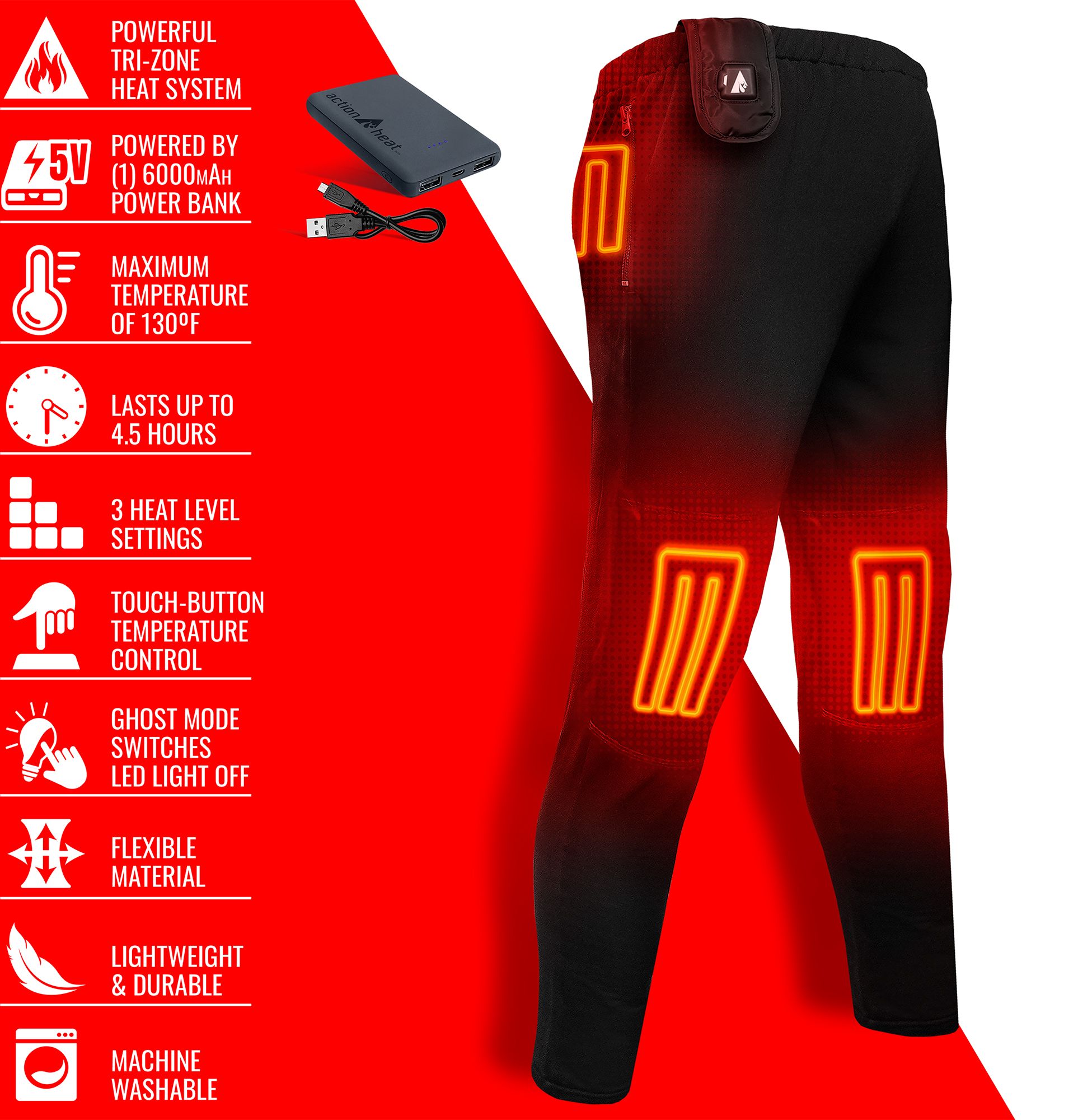 The powerful Tri-Zone heating system includes 3 built-in heating panels, strategically placed on the knee/thigh and backside/seat for balanced warmth