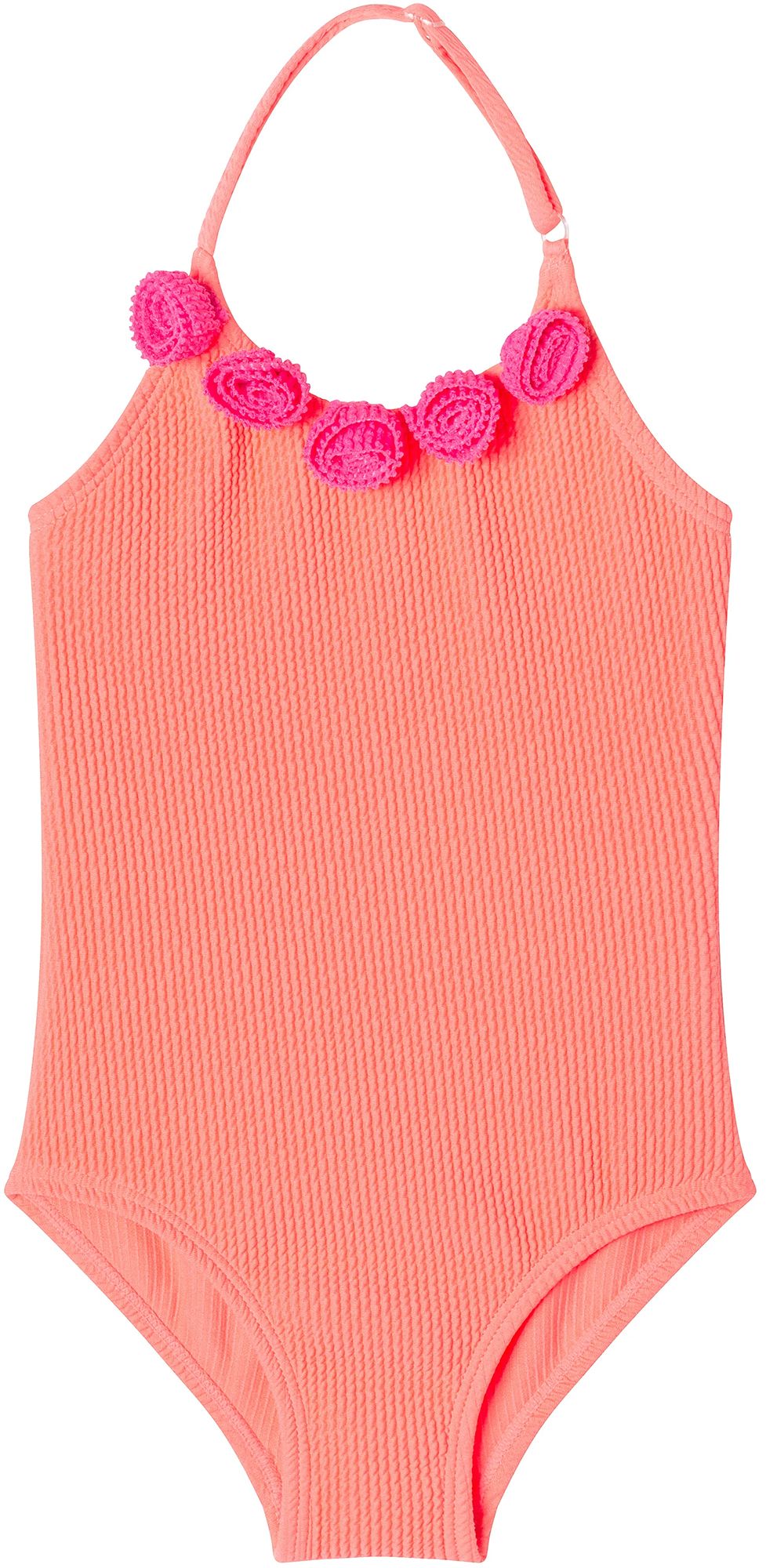 Let your little one bloom in the sun with this vibrant one-piece halter swimsuit! Featuring soft textured fabric and playful 3D floral appliqués, this suit combines comfort with standout charm. Perfect for beach days and poolside twirls, it’s a sweet and stylish choice for your toddler girl.