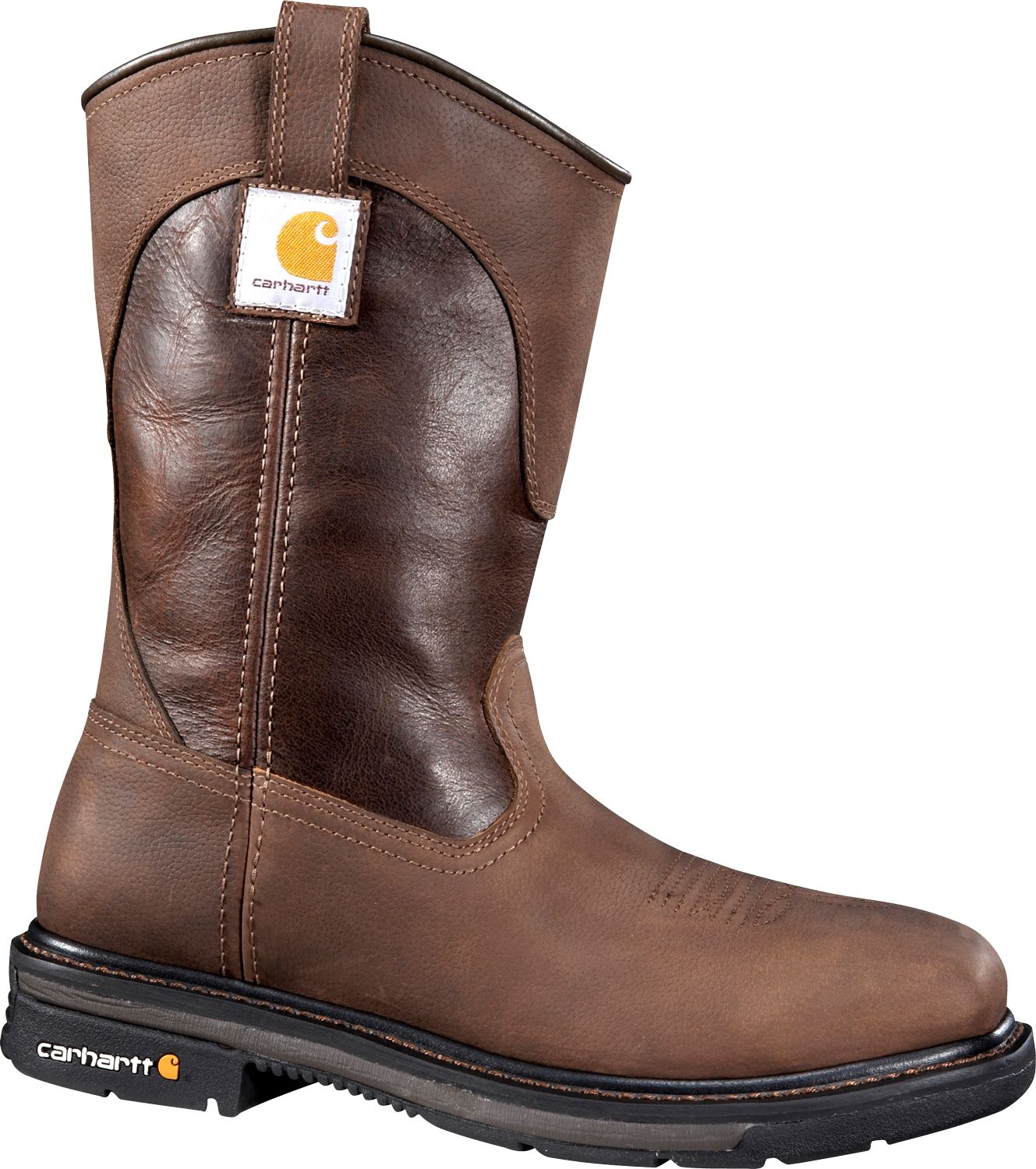 A hard day’s work comes easier with the Carhartt® Wellington steel toe work boot. This 11-inch high boot features a square toe and steel toe protection for safety on the job site. Feet feel at ease with the moisture-wicking lining. The shock-absorbing midsole and cushioned insole provide all-day comfort. In the toughest conditions, the Goodyear welt construction stays strong, and the rugged rubber outsole keeps you stable.