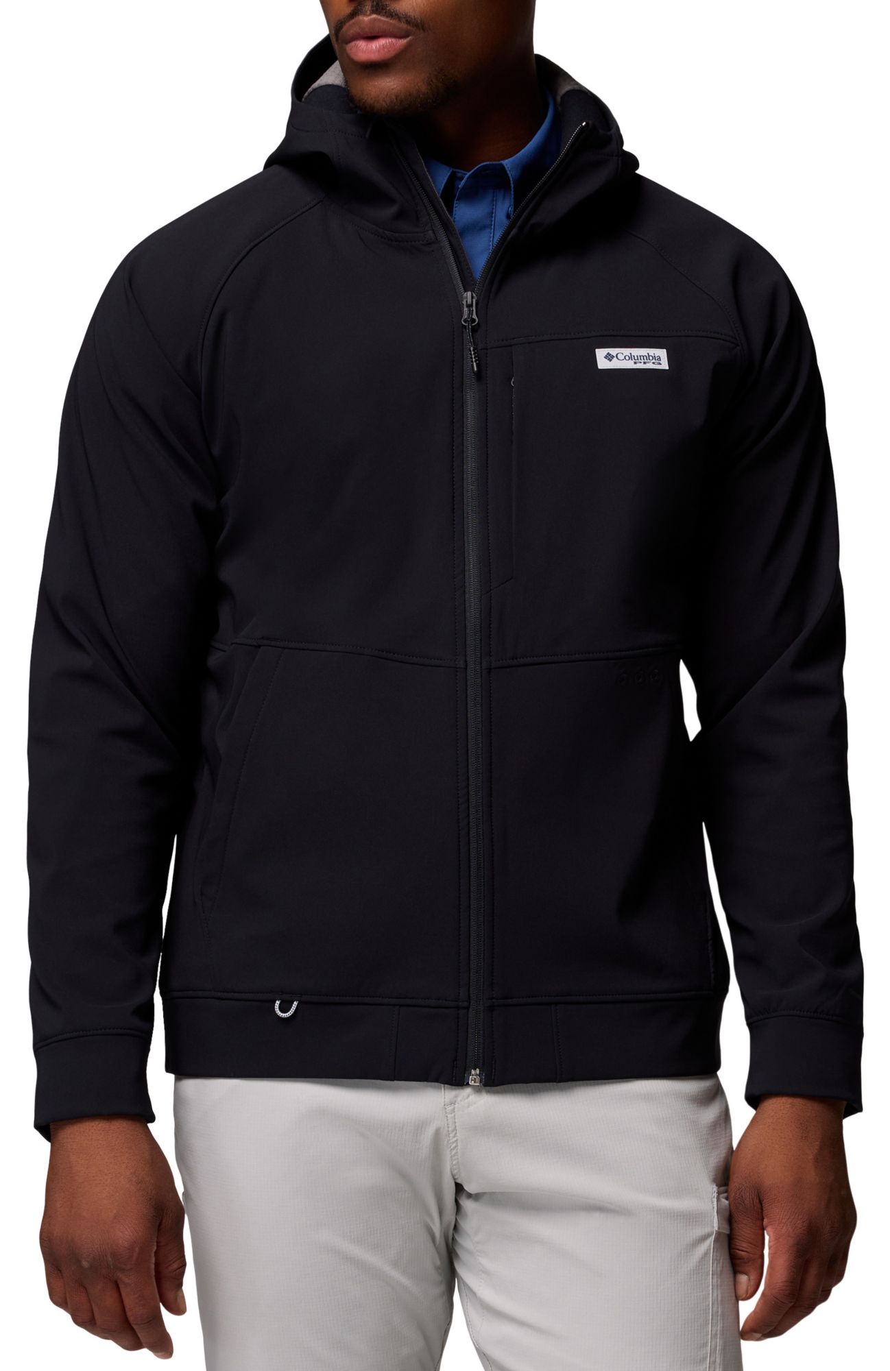 A performance stretch layer made especially for anglers, with advanced rain-and-stain repellency and functional features like a built-in neck warmer, drop-in phone pocket, and crossover hood.