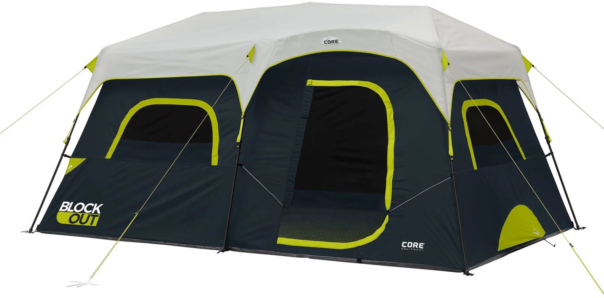 Just took this tent camping for the first time. I thought the blockout technology was going to be a gimmick... BOY WAS I WRONG. it was so dark i literally had to have a flashlight to go into my tent. really enjoyed camping in it. it was easy to setup, easy to pull down. lots of space inside. came with a center divider that was not see through. 2 doors on the "front" and one on the "back". I'm going to be completely honest. I went camping one time and it rained so long and so hard that my tent literally flooded inside to 2 1/2 inches of water. I really would love to be able to buy a full rainfly for this tent to make me completely satisfied. I'm always skeptical of "water resistant" tents. Other than that, this tent rocks and i actually want the larger 12 person or 3 section cabin tent with blockout tech. i think my only gripe is that it doesn't have a door matt with it. but that is not always a bad thing, and i understand that. PLEASE LET ME BUY A FULL RAINFLY FOR THIS!