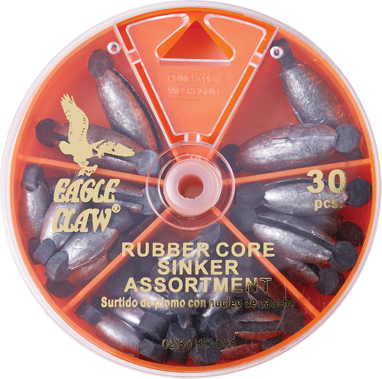 The Eagle Claw® 30-Piece Rubber Core Sinker Assortment includes sinker sizes 1/2 oz., 3/8 oz., 1/4 oz., 1/8 oz. and 1/16 oz. in a convenient dial pack container.