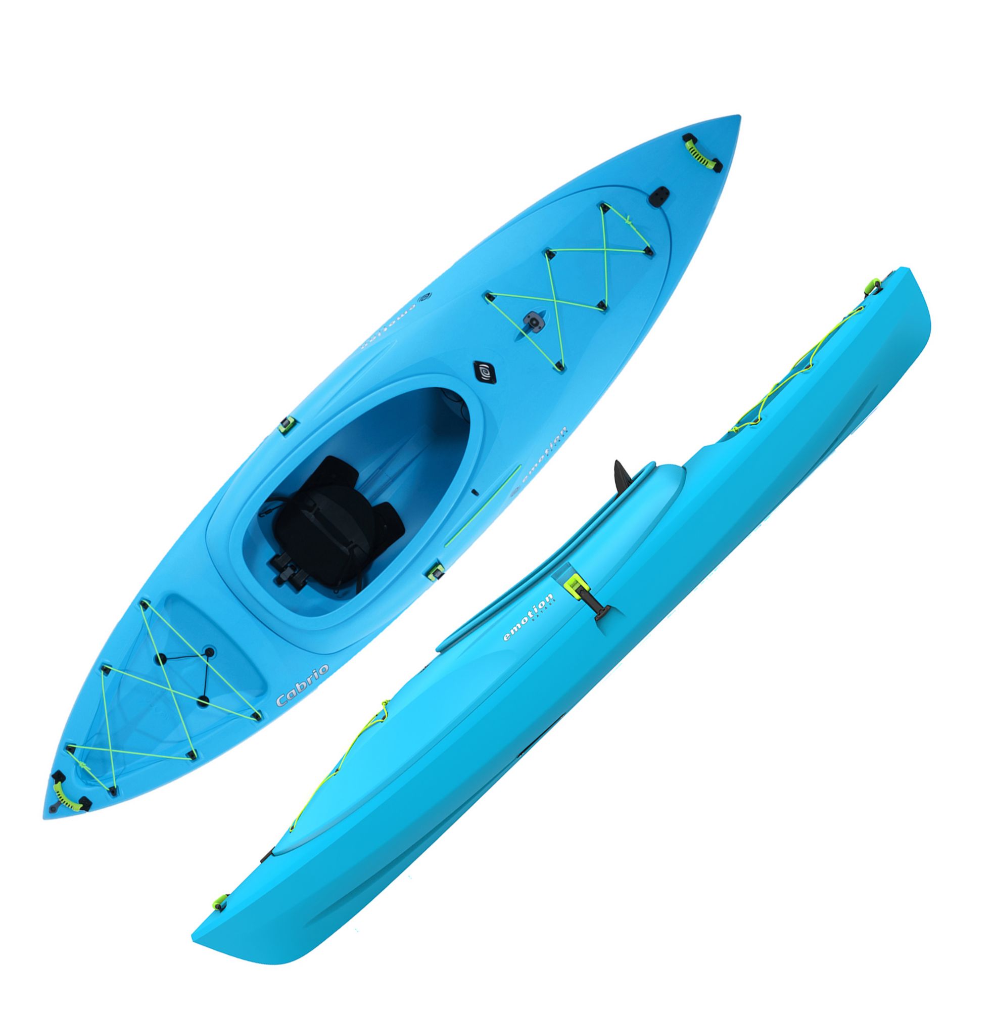 Experience the outdoors on your terms with the innovative Cabrio Kayak from Emotion Kayaks. It’s the first of its kind, a convertible hybrid sit-inside and sit-on-top personal watercraft, so it’s perfect for a variety of conditions and environments. You can take this premium sit-inside kayak on adventures in colder or warmer weather, and remove the cover for an open sit-on-top paddling experience. No matter how you configure it, the Cabrio is built for comfort and performance. With a universal media mount, you can document your adventures with ease. Take advantage of the simple-access storage provided by a deck tankwell with bungee cord lacing to secure items, and keep your hydration close by in the built-in bottle holder. A cockpit storage compartment lets you hold a variety of equipment where it can be accessed quickly and easily. Convenient carry handles help you transport the kayak to and from the water, and paddle keepers will hold your paddles for you and let you reequip them quickly. Experience the water in comfort on a padded seat back and seat pad, while resting your feet in any of the multiple footrest positions. Built-in scupper holes allow water to drain away from the hull, while built-in scupper plugs allow you to keep the kayak watertight. Enjoy the performance and reliability of a kayak made from high-density polyethylene, built for speed, stability, and excellent tracking, with exceptional hull sturdiness and impact resistance. For whatever on-the-water adventure you’re planning next, the Cabrio Kayak from Emotion Kayaks has the power and features to make it your best one yet.