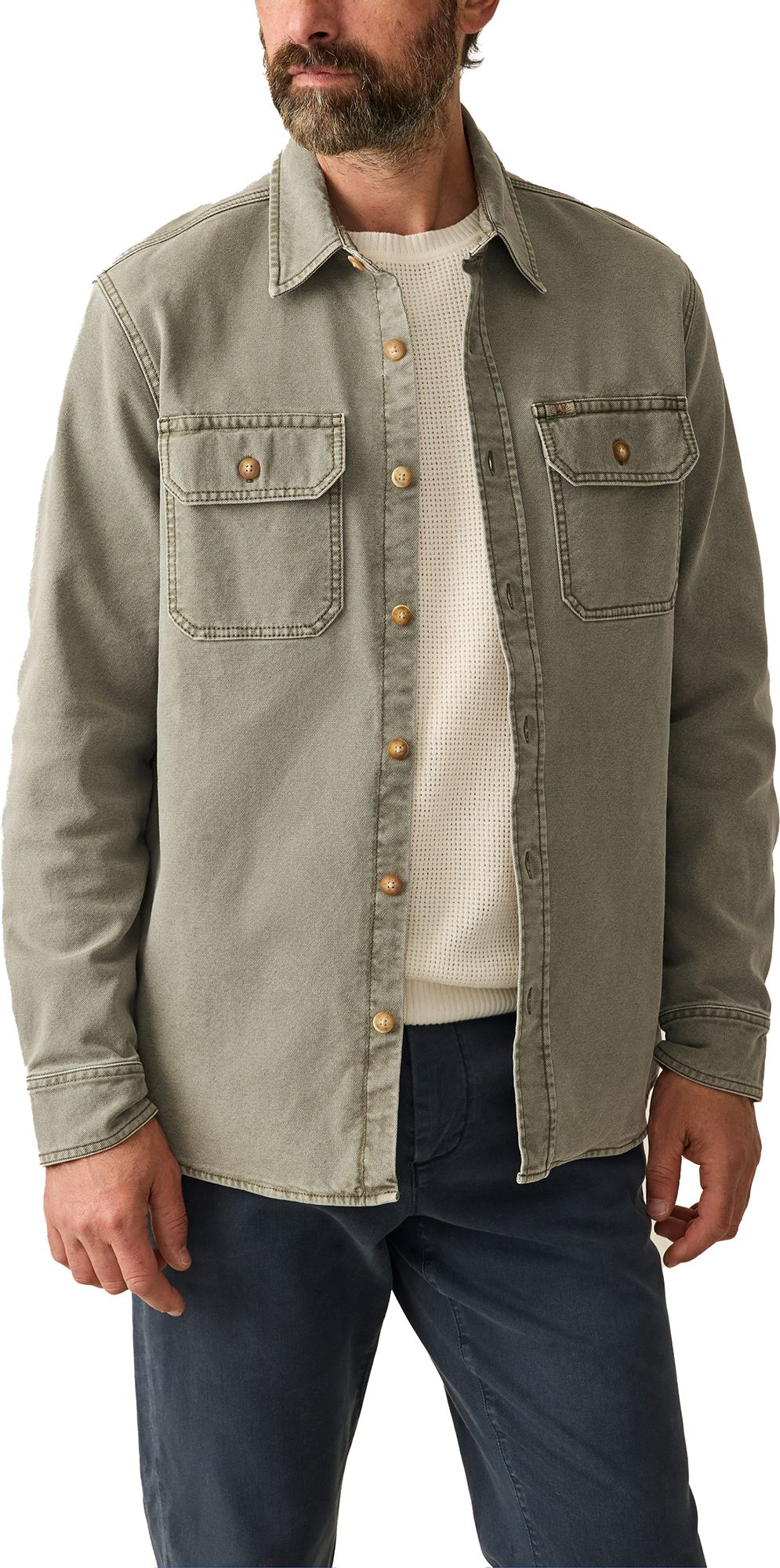 Perfectly washed with an authentic faded look, this shirt jacket is the newest addition to our Sunwashed collection. Its relaxed fit and rugged texture bring an effortlessly cool vibe to any outfit. Combining both style and practicality, you'll be throwing it on over everything this season.