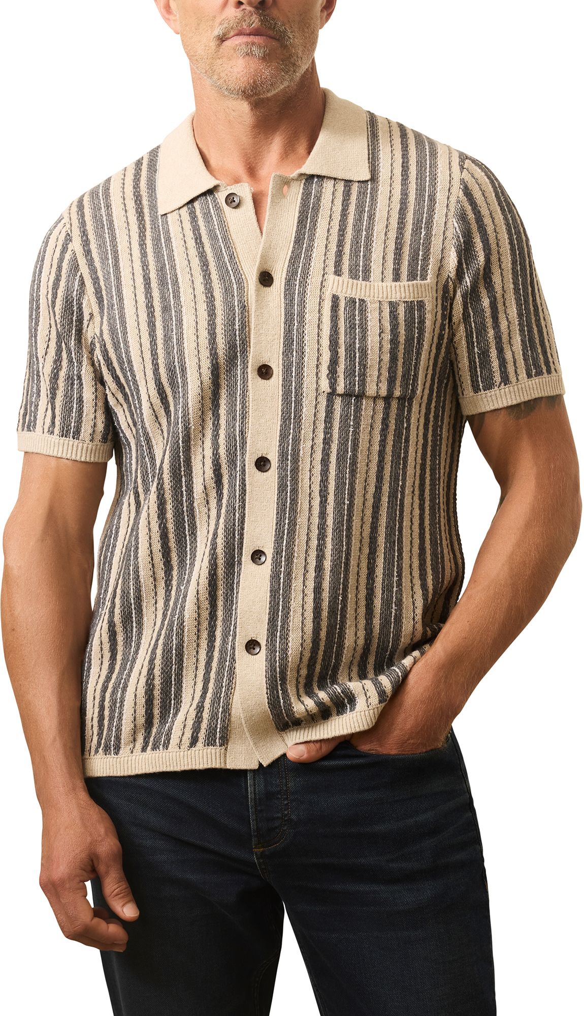 A fresh take on vintage knitwear, this short sleeve sweater blends the breathable ease of cotton and linen with refined details that set it apart. The textured knit feels cool and relaxed, while contrast stitching at the collar, cuffs, and hem adds just the right amount of character. Finished with a six-button placket for versatile styling, it's a polished yet laid-back staple ideal for warm days when a tee feels too casual but a shirt feels like too much.