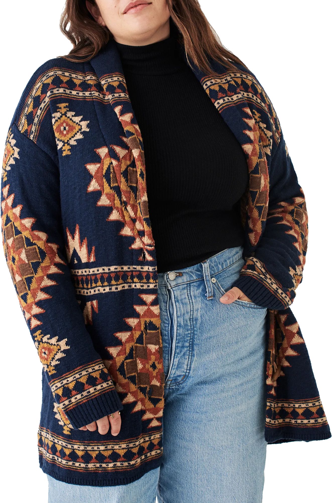 I absolutely love this cardigan. It is the perfect length and style. I did size down to a small (normally medium) for a more fitted look. I love the pattern and colors.