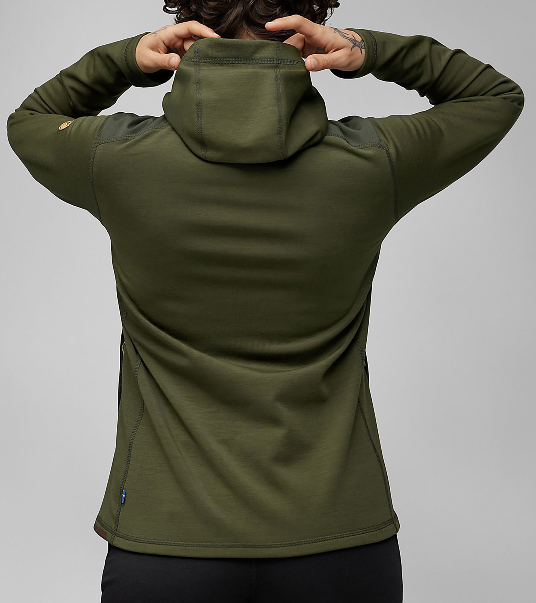 Made from recycled polyester and traceable wool with a flat-knitted, low-friction exterior and a brushed finish interior