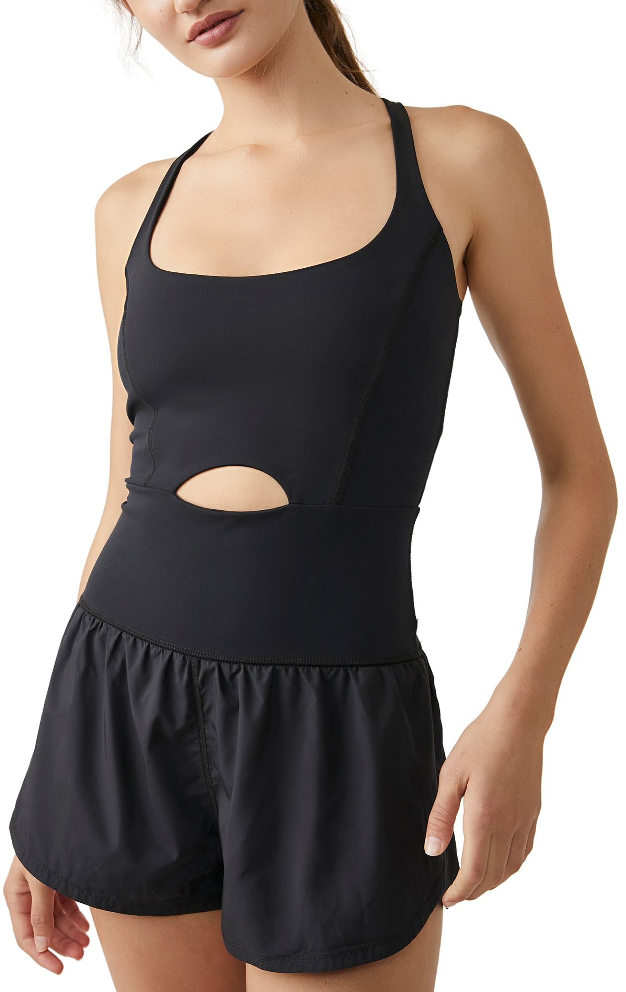 The perfect one-and-done running outfit, this easy romper features a slim-fitting top with a cooling cutout at the center paired with airy retro-style shorts.