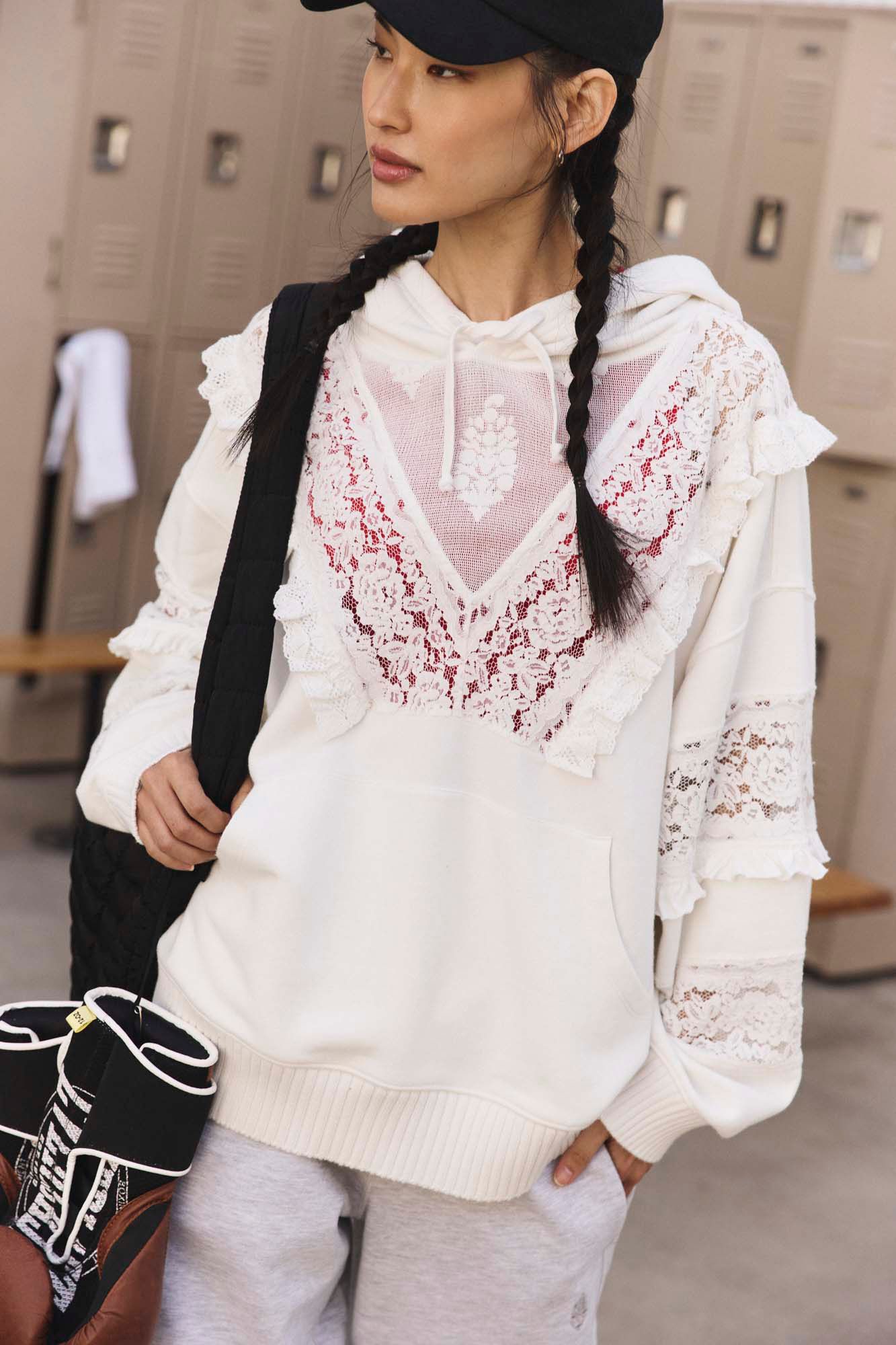 Add a functional yet fashionable touch to your workout-ready wardrobe rotation with this super cool tunic featured in a slouchy, hooded style with sheer mesh piecing and defined lace detailing throughout for a special, femme finish.