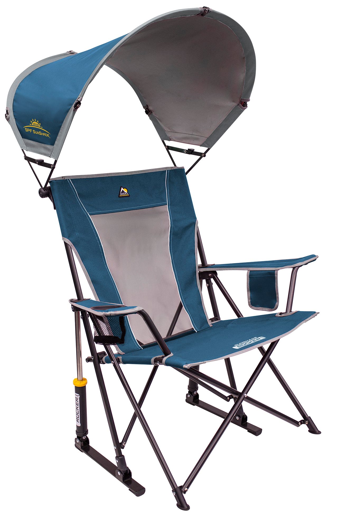 Stay cool and comfortable in the GCI Outdoor SunShade Rocker™. Featuring patented Spring-Action Rocking Technology™ for a smooth rocking motion and a UPF 50+ canopy for extra sun protection, it’s the perfect all-in-one solution for outdoor relaxation. The tall, angled backrest offers a laid-back seating position, while the built-in beverage holder and phone pocket keep essentials within reach. Crafted with a sturdy steel frame that supports up to 250 lbs., it also features a convenient shoulder carry strap for effortless transport. On sunny days, the adjustable shade rotates forward and back, allowing you to customize your coverage or collapse it completely when the sun sets. Plus, a breathable mesh panel enhances airflow to keep you cool and dry—making it the ideal chair for sideline cheering, pre-game tailgating, or backyard barbecuing.