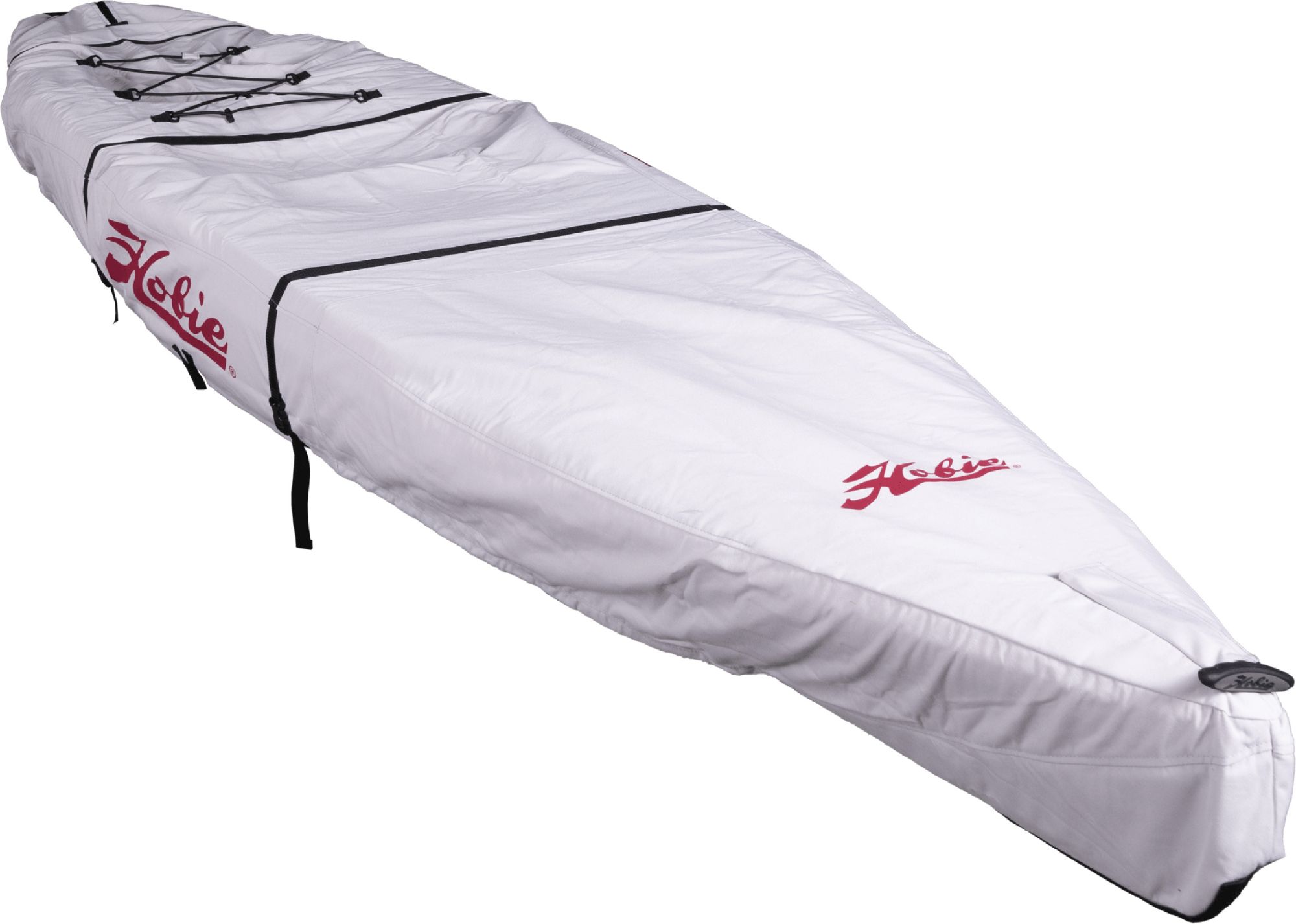 Easy to install or remove, fits over the hull (like a fitted sheet on a mattress). Straps and pull string adjust for a tighter fit. Cross straps secure the cover on your hull for windy conditions. Heavy duty UV resistant canvas material in a neutral color for better aging. Universal covers fit over the hull when upright or upside down. To help prevent distortions to the hull bottom shape, Hobie recommends that our kayak hulls be stored upside down resting on the cockpit rails. This is also best for deflecting rainwater and prevents water pooling in the cockpit or on the cover. When planning to store a hull upright, be sure to properly support the hull bottom to prevent hull distortions.