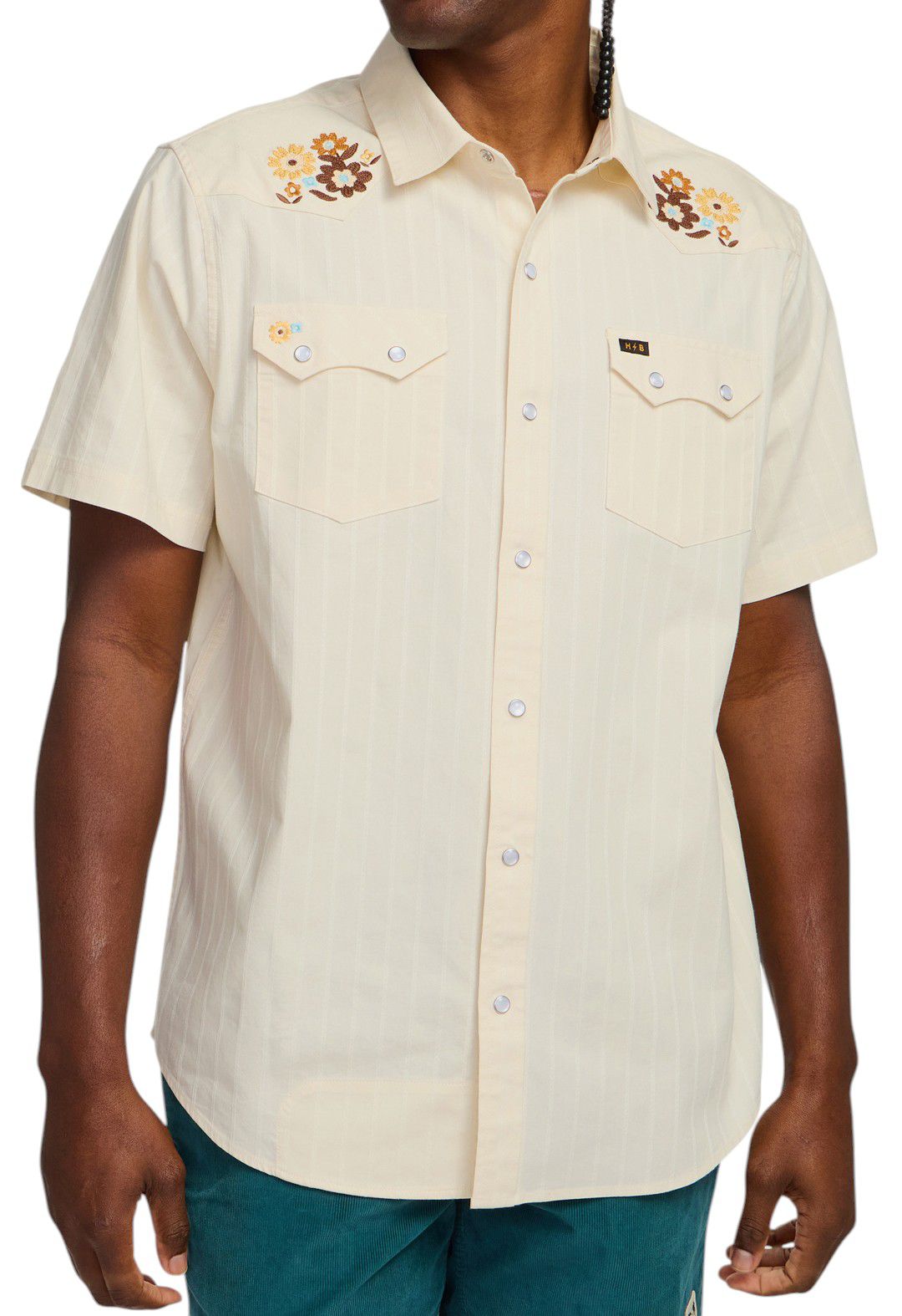 • Button-down style features pearl snaps