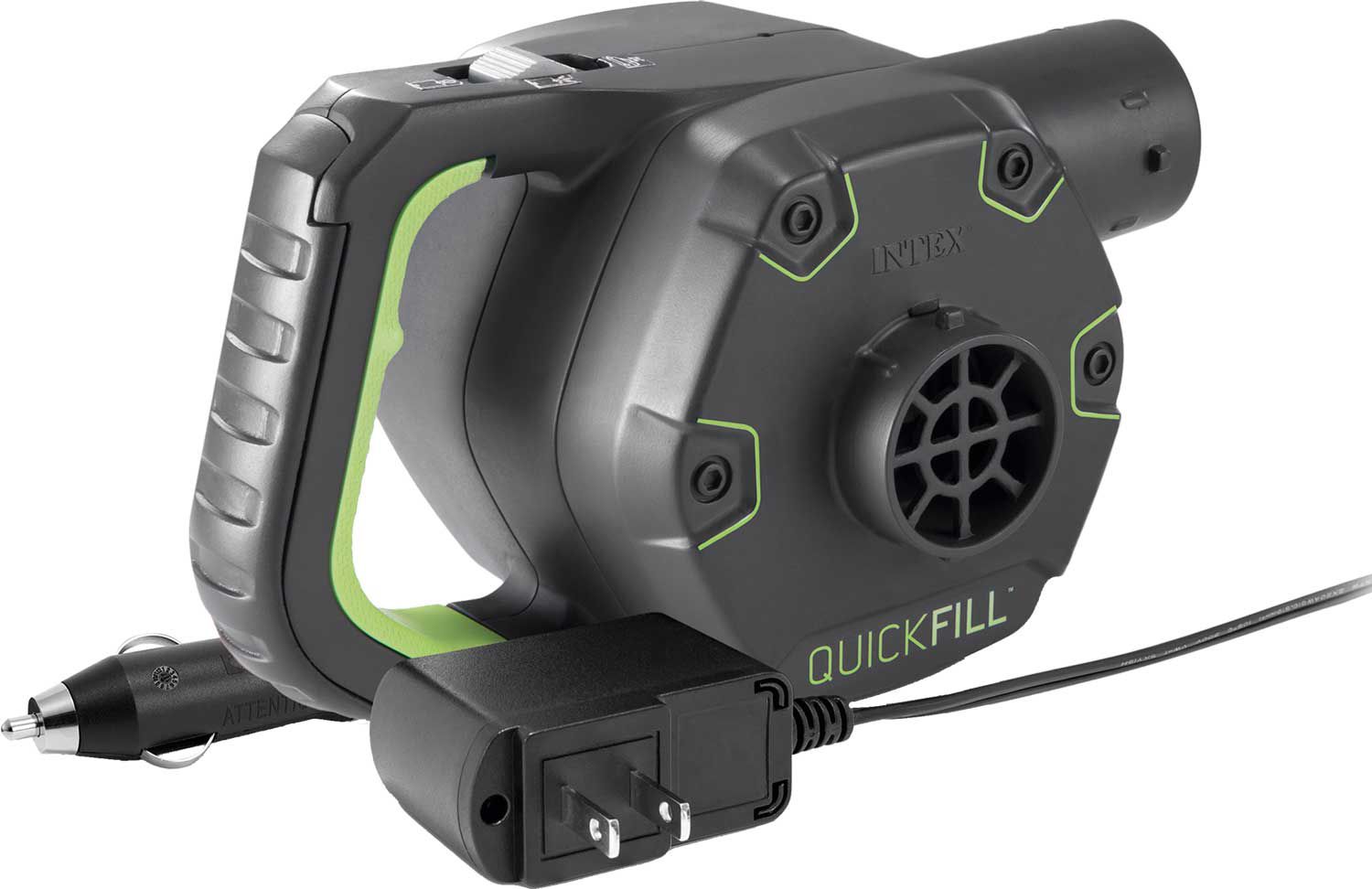Get your airbed set-up quickly and easily using the Intex Quick-Fill Rechargeable Pump. This pump operates with three interconnecting nozzles, allowing for rapid inflation. It is versatile in use, allowing you to recharge using either AC household power or DC power from a vehicle. For safety, it includes a battery charging indicator and a shut-off feature to prevent overcharging.