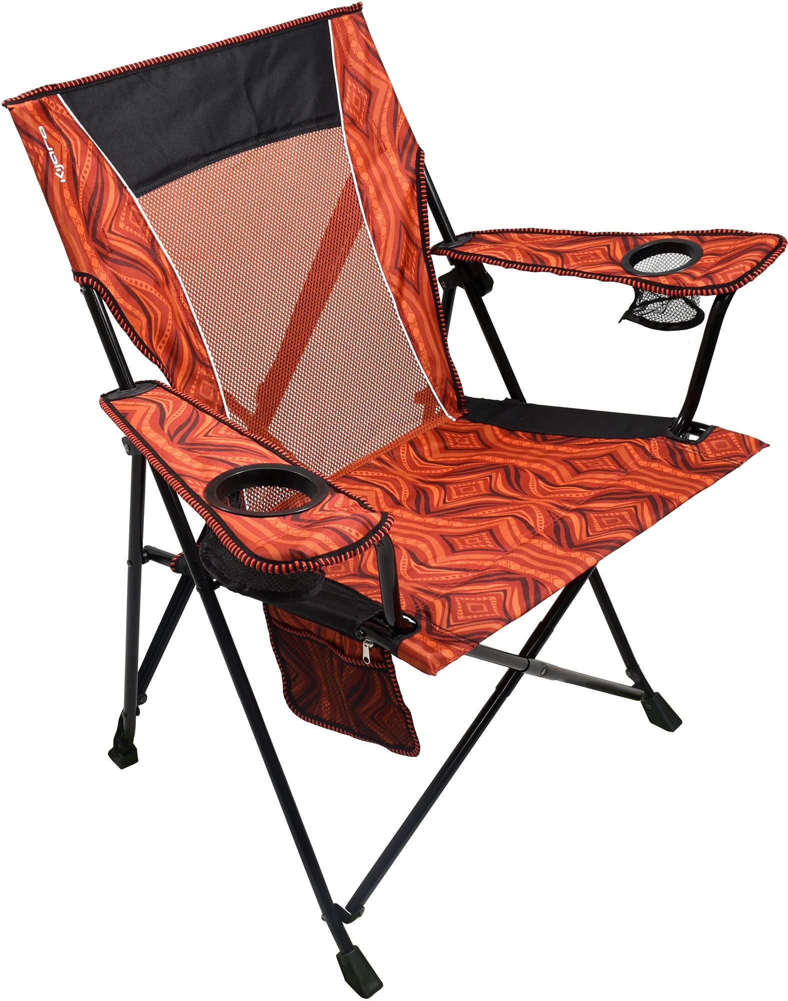 The Kijaro Destination Print Dual Lock Chair provides a premium seating experience with no sag seating. This adult camping chair locks in the folded position for easy portability without the carry bag and locks in the open position for maximum seat and back support. This lawn chair also features 2 cup holders, an organizer with a zipper pouch, and mesh pockets. Use the included carry bag to carry your portable camping chair or use the Dual Lock Experience to lock your chair closed and carry it with the attached carry strap. The Kijaro Dual Lock Chair is the perfect companion for your next great adventure. Each chair highlights a pattern inspired by one of our color destinations. This chair has the Dual Lock Experience Kijaro is known for, plus an updated cup holder!