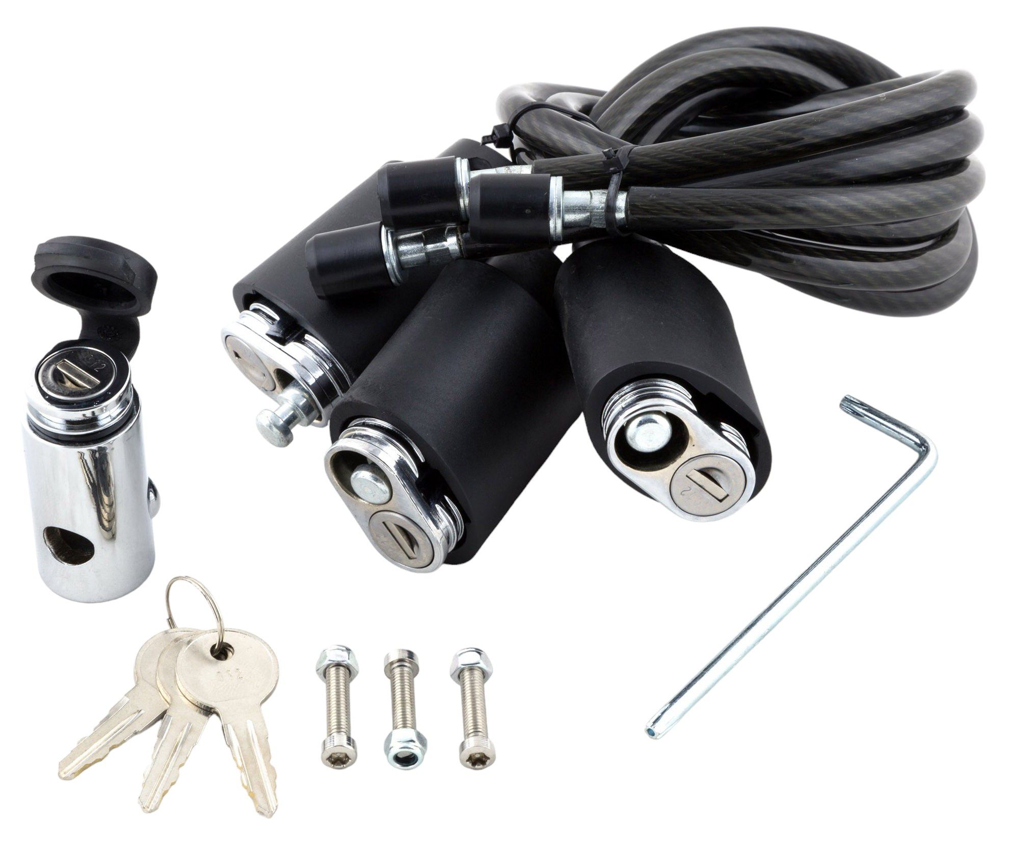 The lock set was easy to install (about a 10 minute job) and all of the tools necessary were included. There are no dust covers for the locks as shown in the pictures, so the keyholes are exposed all of the time. So far this has not been a problem and the locks continue to work without issue. The cables are quite short though, and will not wrap all the way through the frame on some of my bikes. There is enough cable to wrap around the fork arch though so the bikes are still relatively secure. Because the cables are often quite tight against the frame or fork, I don't drive with the locks on for fear of damaging the finish on my frame. The cables seem strong but are still just cables. A determined thief could cut the cables without too much difficulty or specialized tools. The system works well for short stops (gas station, grocery store, etc.) but I suggest supplementing with sturdier U-locks for longer-term situations or in high theft areas.