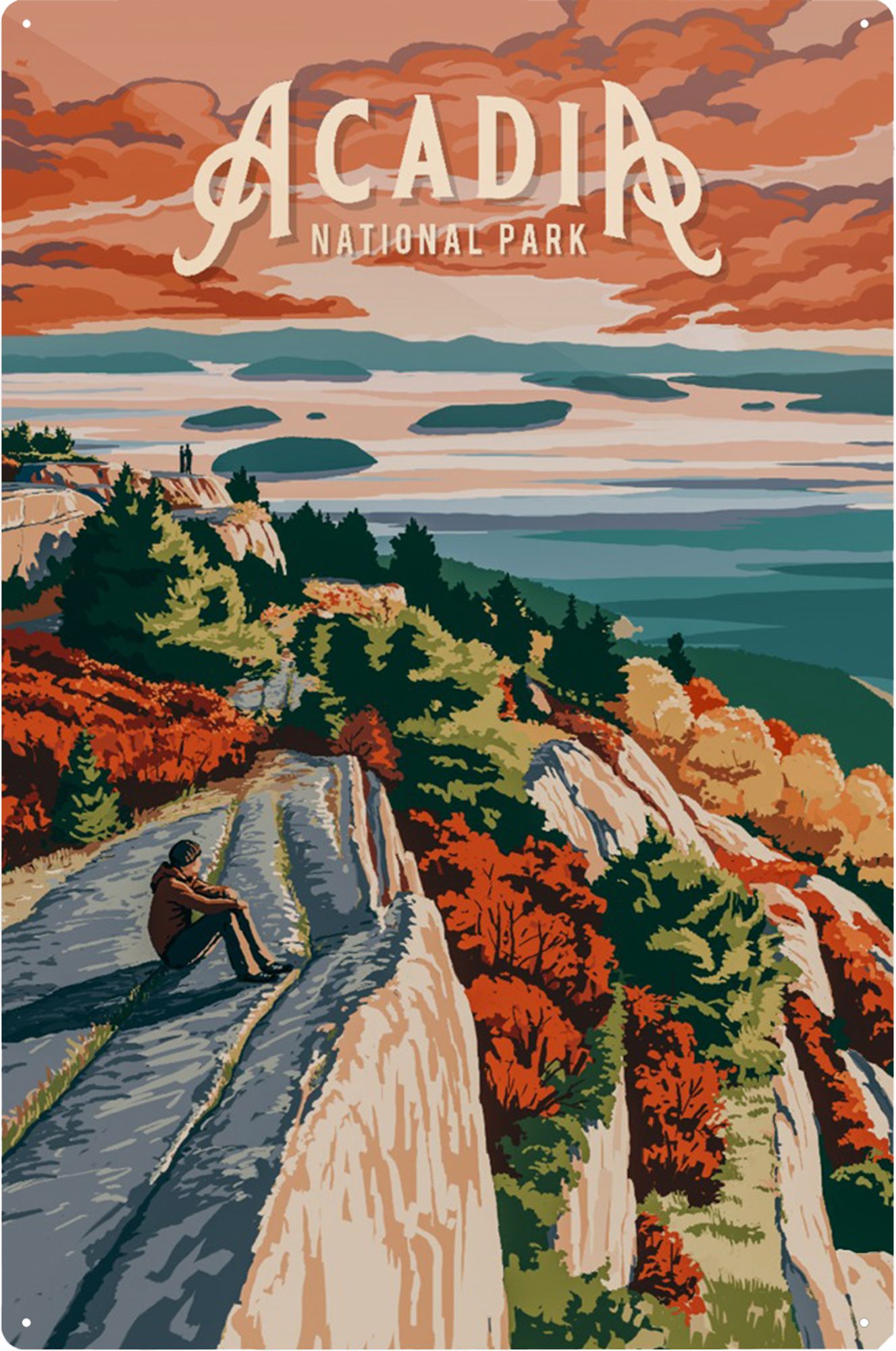 This original high-quality metal art sign from Lantern Press boasts sharp detail and vivid imagery of Acadia National Park, Maine.
