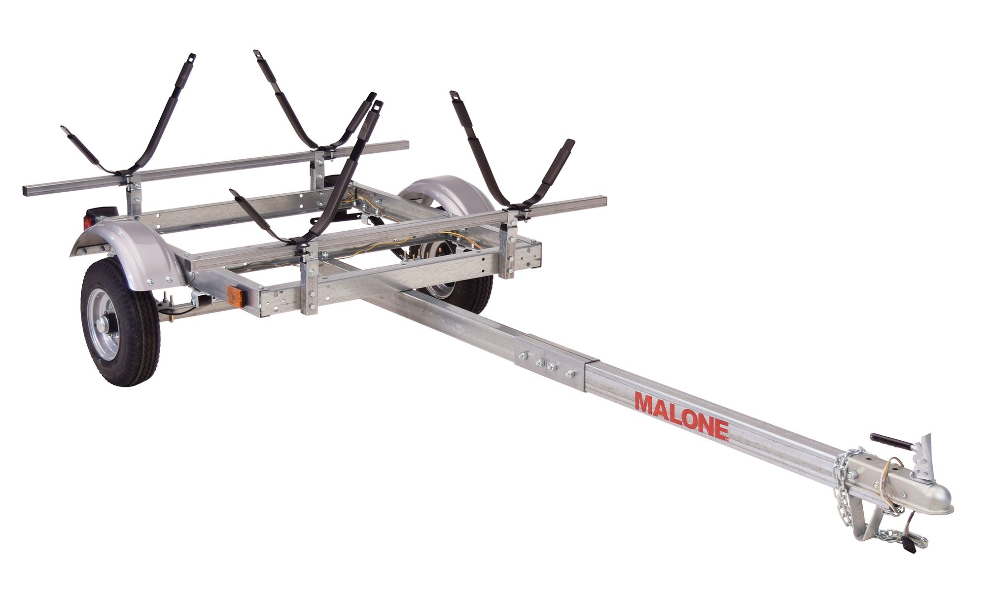 Constructed with high grade galvanized steel, the Malone® EcoLight 2 Kayak Trailer Kit with J-Racks offers the durability you need in a trailer. With the ability to easily travel at most posted speed limits, you’ll be able to haul your precious cargo to and from your adventure location in no time at all. This two kayak trailer features two J-style kayak carrier racks with all mounting hardware for easy and efficient transport to and from the water this season.