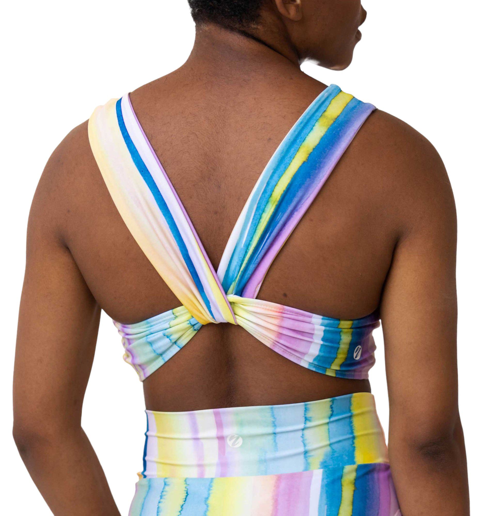 Nani’s Switch V back is a modern twist on standard cross-back styles with a single, continuous strap that twists around the bottom band