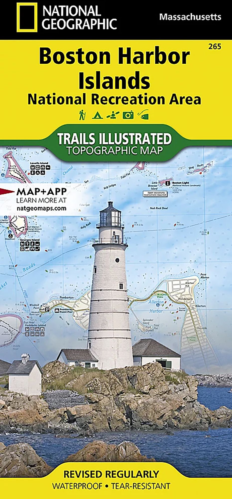 Located just outside of downtown Boston, the Boston Harbor Islands provide an abundance of recreational opportunities for all outdoor enthusiasts. Expertly researched and created in cooperation with the National Park Service, Boston Harbor Islands Alliance and many others, National Geographic's Trails Illustrated map of Boston Harbor Islands National Recreation Area is an essential travel companion for all visitors to the area. The front side of the map contains both topography and bathymetry, while the reverse side shows the area in high-resolution satellite imagery. Together they provide unparalleled detail of all 34 harbor islands, shorelines, downtown Boston and neighboring communities, Boston Inner Harbor and the other waterways that surround the islands.Mainland piers with park operated ferries to the islands are clearly marked along with their facilities as well as water taxi stations. Boaters will find boat ramps, docks, moorings, buoys, beacons and soundings. Background information of many of the islands is provided along with hiking and biking trails, available facilities and pinpointed structures, buildings and other points of interest. Other recreational features noted include areas for fishing, swimming, diving, canoeing, kayaking, cross-country skiing, wildlife viewing, camping and picnicking. The map also provides a complete road network of the area along with subway, commuter rail stations.