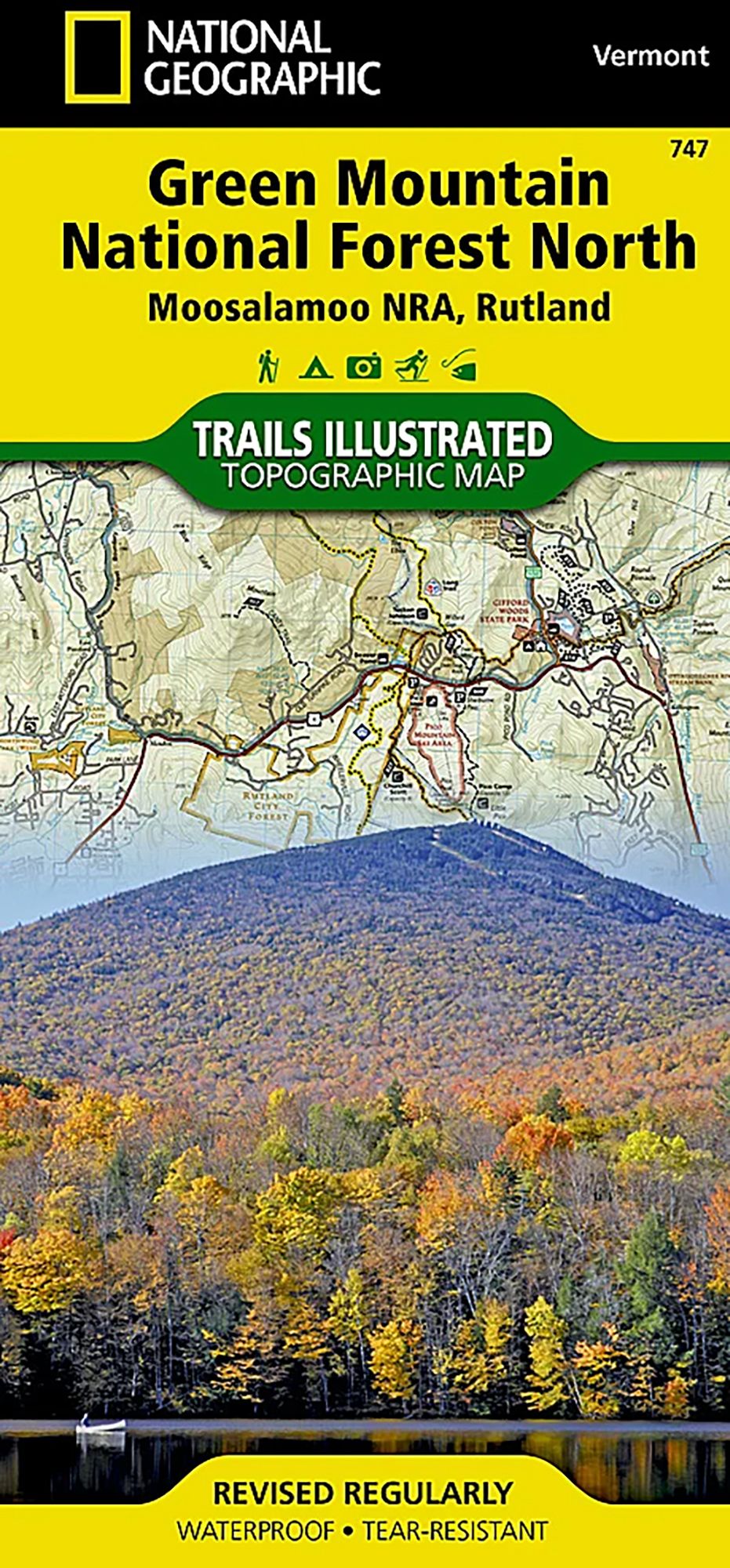 The Green Mountain National Forest encompasses more than 400,000 acres in southwestern and central Vermont, forming the largest contiguous public land area in the state. National Geographic's Trails Illustrated map of Green Mountain National Forest North combines unmatched detail with helpful information to offer an invaluable tool for making the most of your visit to this beautiful region. Expertly researched and created in partnership with local land management agencies, this map features key points of interest including Moosalamoo National Recreation Area; Branbury, Bomoseen, Ainsworth, Allis, Granville Reservation, and Silver Lake state parks; Killington, Pico Mountain, and Sugarbush ski areas; Chittenden Reservoir; Bristol Cliffs, Breadloaf, and Joseph Battel wilderness areas; and portions of the White, Connecticut, and Ottauquechee rivers.This map can guide you off the beaten path and back again with hundreds of miles of mapped trails including portions of the popular Long, Appalachian, and Catamount trails. The Lake Champlain and Mad River scenic byways are noted for those wishing to take in the scenery by car. The map base includes contour lines and elevations for summits, passes and many lakes. Many recreation features are noted as well, including interpretive trails, campgrounds, swimming areas, boat launches, waterfalls, shooting ranges, fishing areas, and covered bridges.