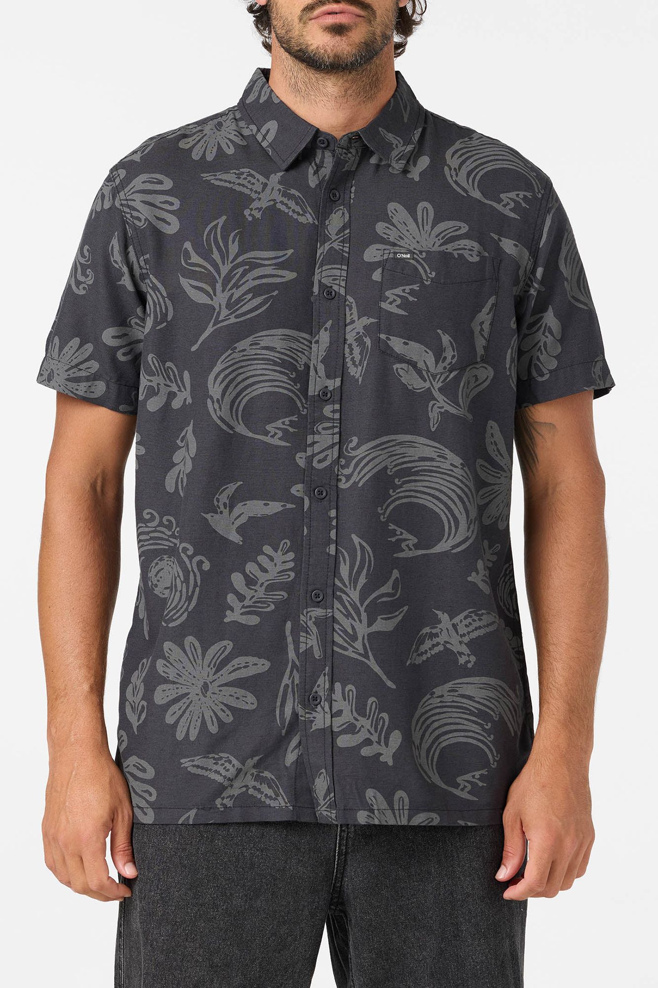 This classic button-up shirt is great for any casual occasion. It has a premium EcoVera fabric feel, straight bottom hemline and allover print.
