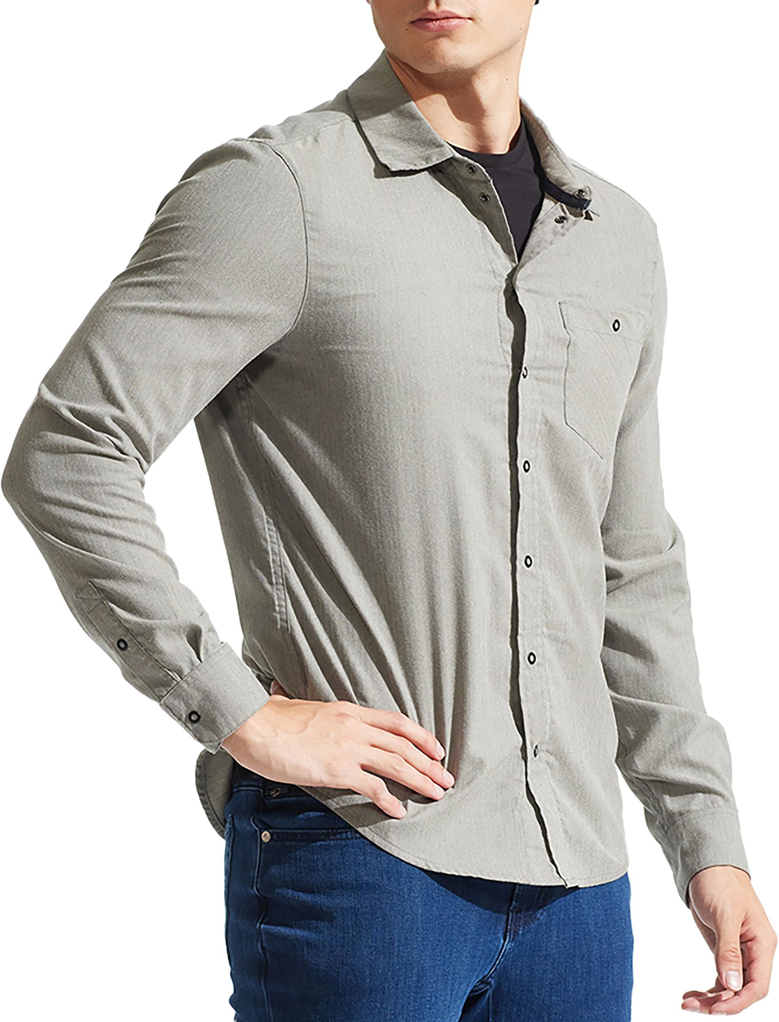 Polyester twill construction feels like flannel but features wicking performance like a cycling jersey