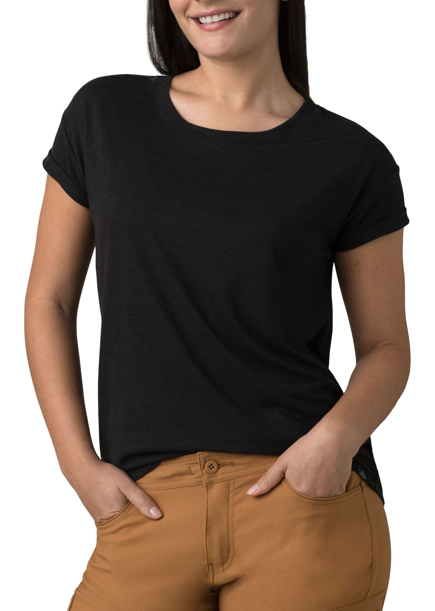 I love this t-shirt! I have several of them. The style is flattering and matches casual pants, jeans, yoga pants and other athletic bottoms. I have two in the camo pattern that I wear to work under my company logo polar fleece jackets. I have been washing them by hand and air-drying them. They are lasting really well.
