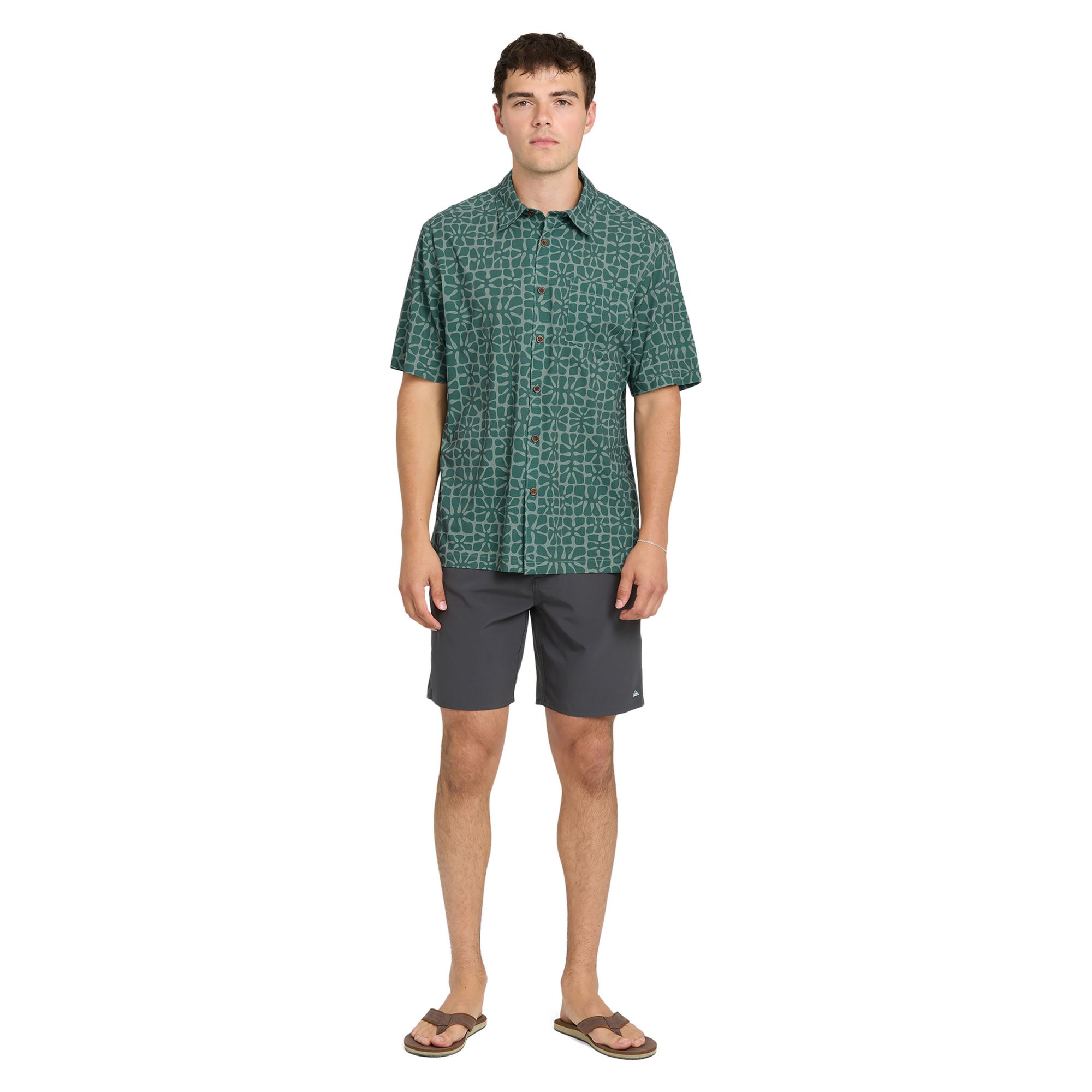 The Quiksilver Coral Sea Shirt delivers breezy comfort with bold abstract print styling. Featuring a lightweight perforated fabric, this short sleeve woven offers breathable, quick-drying performance for warm-weather wear.