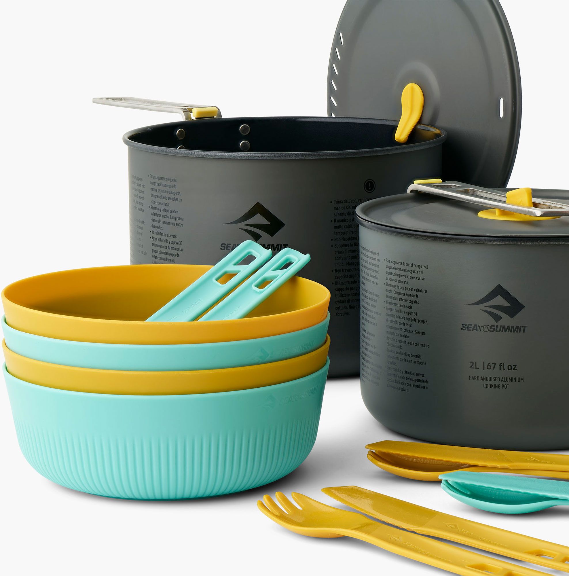 This is such a great set that fits all together perfect for traveling. The utensils snap together & are decent sized for adults & children to use. I love that it includes a microfiber type of cloth to protect the pots from moving around. The material is very durable and will hold heat very well. Highly recommend for those looking for a set that comes with a bit of everything