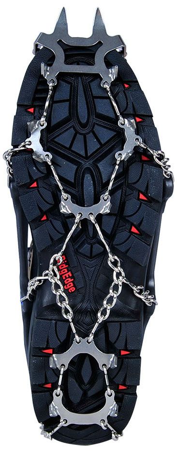 The Snowline Chainsen Ultra Crampons are somewhere between microspikes and crampons. For my crampons to be secure I have to wear mountaineering boots, which is fine in the winter. For the rest of the year when I am wearing hiking or approach shoes and need traction on snow fields these Ultras fit securely. They have good size spikes for microspikes and front points like crampons; so, good enough for climbing moderate inclines. I wear a women's size 8.5 and medium works.