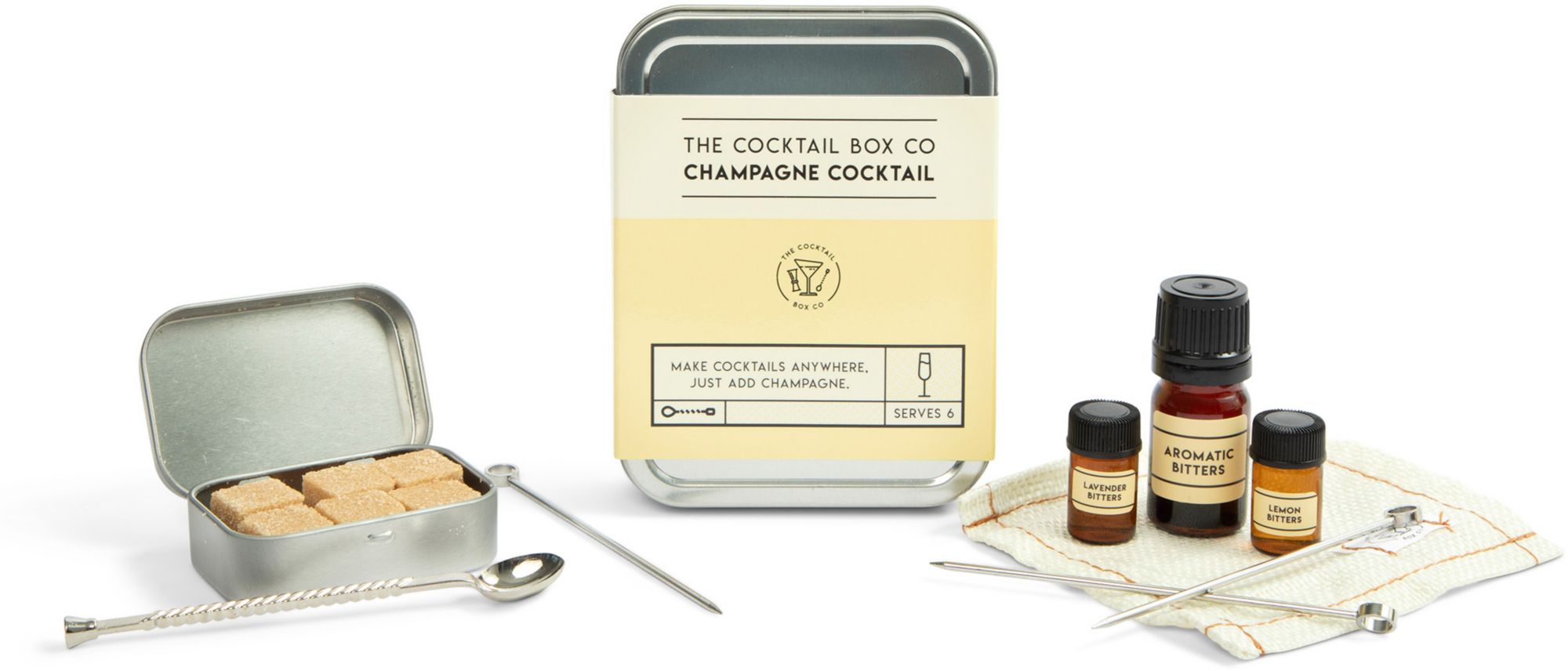 This beautifully designed cocktail kit serves 6 hand-crafted premium Champagne cocktails
